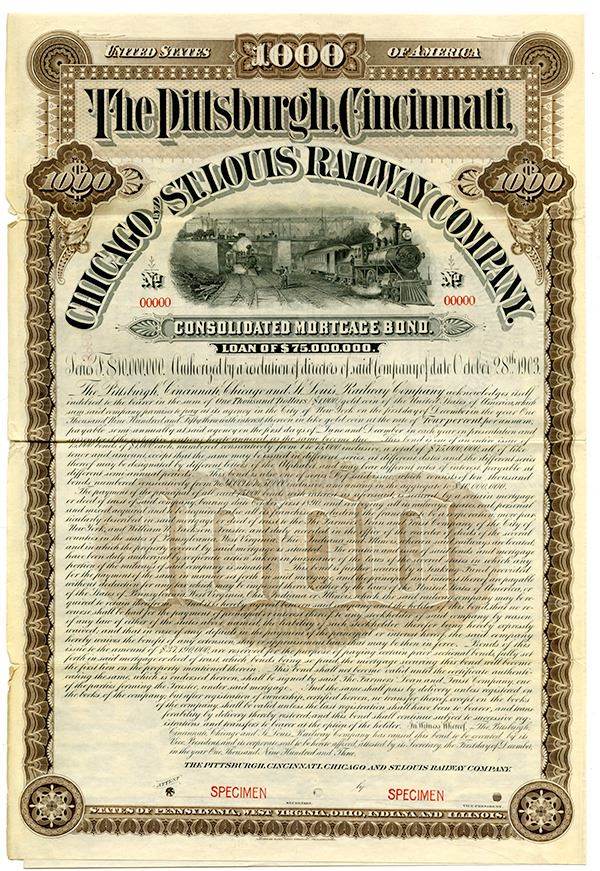 PA, WV, OH, IN, IL. 1903, $1000, Specimen 4% Consolidated Mortgage Gold Coupon Bond, Black on brown border, trains passing under signal tower under arched title, 1 of 2 examples found in the ABN archives in 2002. No other examples have been seen and this is the only available example.