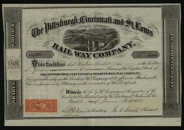 Steubenville, Ohio. 1868. 5 Shares, #100, Issued and uncancelled, Locomotive over bridge on river in background, Revenue Stamp attached. VF-XF. Scarce and very attractive Ohio railroad. Hel.
