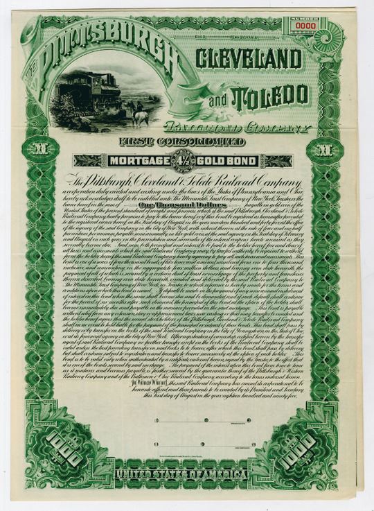 Ohio; Pennsylvania. $1,000, 1st consolidated mortgage, 4.5%, 50-yr, 1895, due 1945, vertical format, bearer gold coupon bond, loco #375 passes Native American on horseback in stream, l-r, ('The Fast Mail') top left ,by IBN. Only known as a specimen in Cox. This is the only example we have seen.