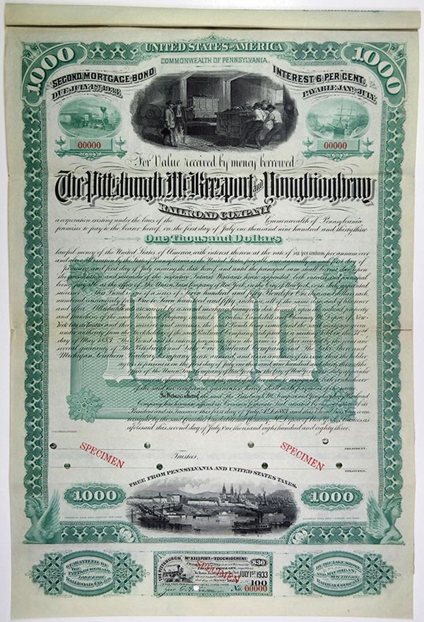 Pennsylvania. $1000 Specimen 6% Second Mortgage Coupon Bond, Black text with green border and undertint, Allegorical scene of coal miners at work on train tracks at top, with depiction of Pittsburgh at bottom. Red specimen overprints, "00000" serial numbers and POC's, Fine condition with splitting along center horizontal fold line, ABNC. Only known as a specimen in Cox, unlisted issued. 3 examples found in the ABN archives.