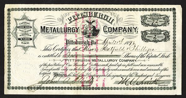 PA. 2 Shrs Stock Certificate. Issued. Uncancelled (but with 1892 typed across front). VF