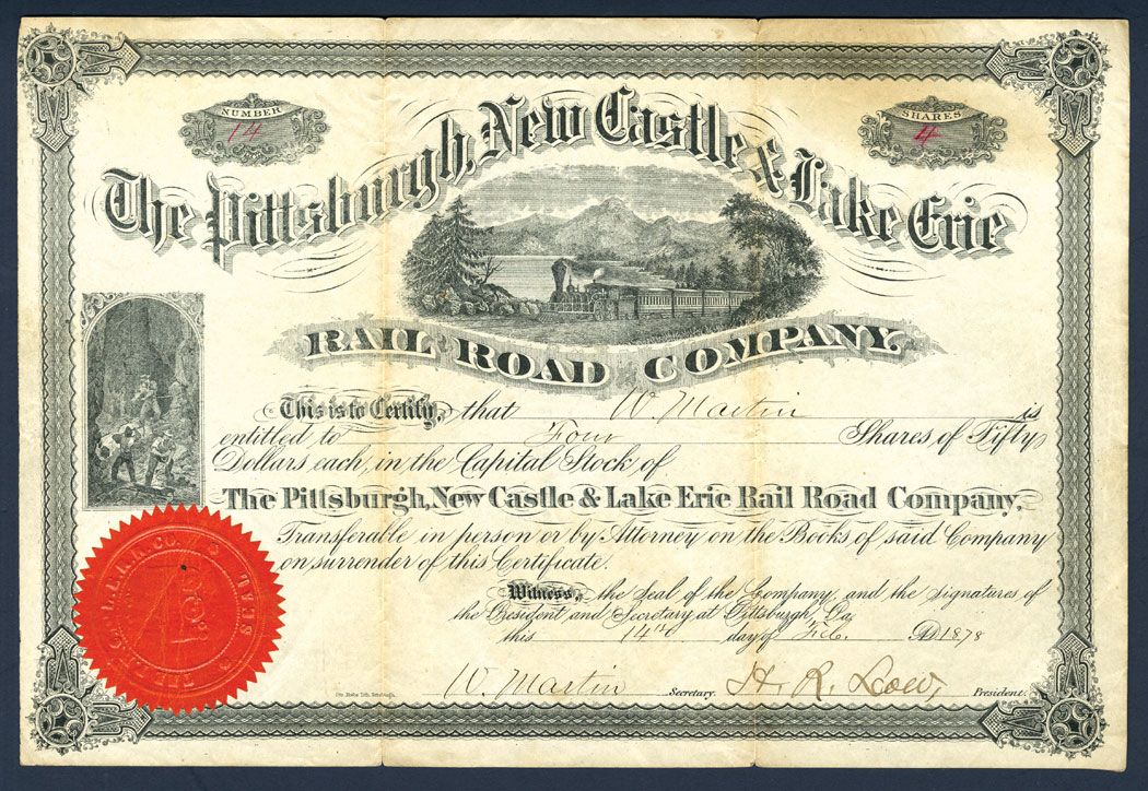 Pittsburgh, PA, 4 Shares, I/U, Locomotive R-L in countryside, miners left, with red corporate seal, S/N 14, Cox reports 25 found, this is the only one I have seen. Kre.