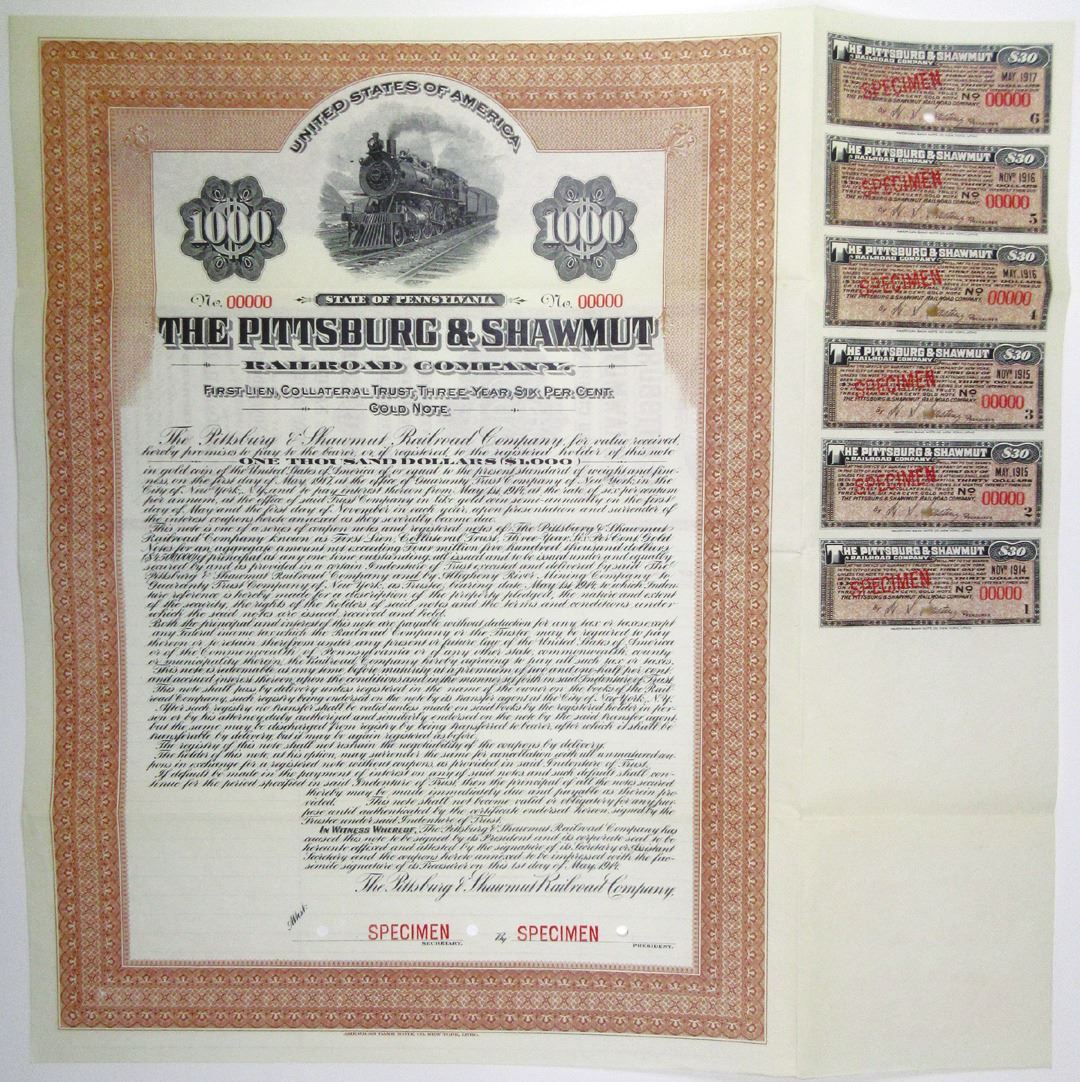 Pennsylvania, 1914. $1000 Specimen 6% First Lien Collateral Trust Gold Bond Note, Black text with brown border, Train approaching illustrated at top. Red specimen overprints, 00000 serial numbers, POCs, Fine condition, ABNC. Unlisted color in Cox, Rare.