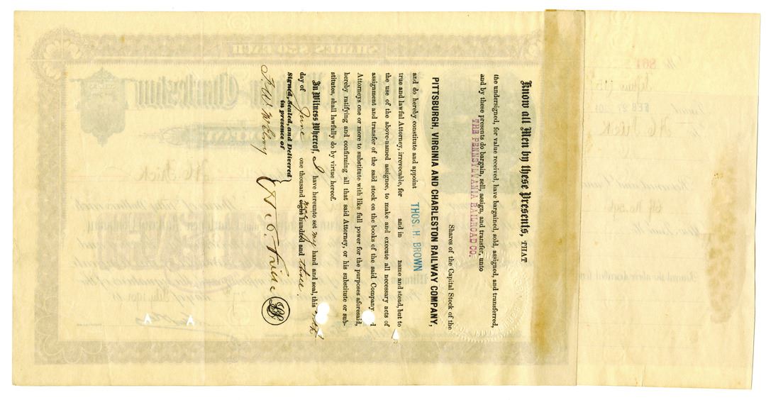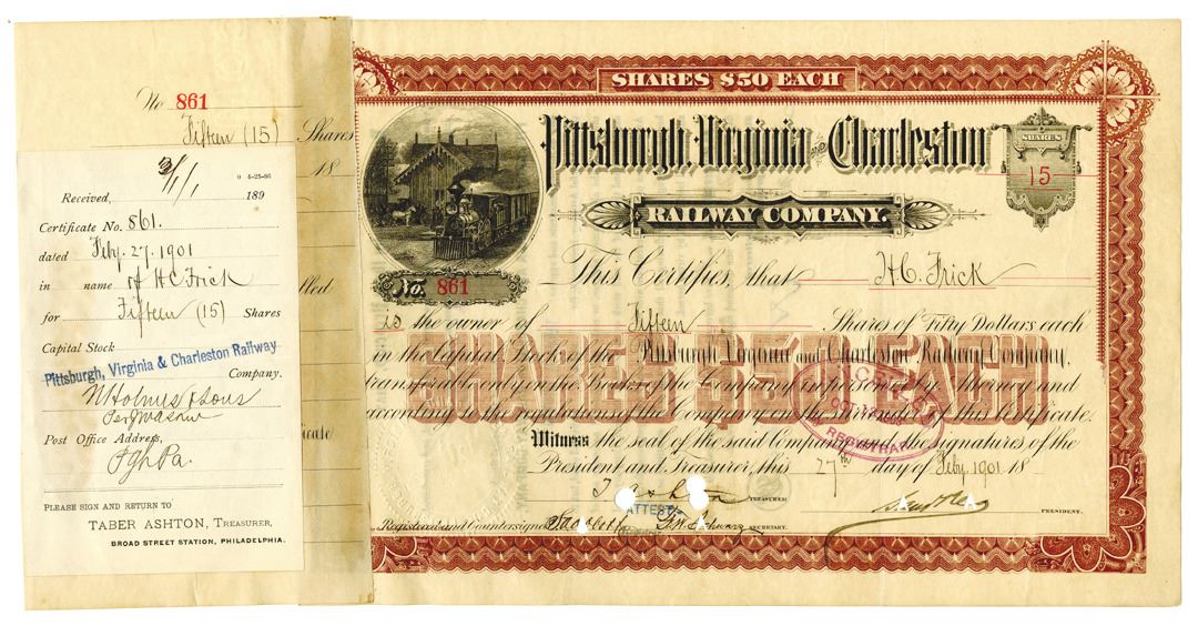 Pennsylvania.... 1901. 15 Shares I/C Capital Stock Certificate Issued to Henry Clay Frick, Black text with brown border and underprint, Train approaching a rural stop at top left. Cancelled stamp and POCs. Fine condition, ABNC. Henry Clay Frick (December 19, 1849 Ð December 2, 1919) was an American industrialist, financier, union-buster, and art patron. He founded the H. C. Frick & Company coke manufacturing company, was chairman of the Carnegie Steel Company, and played a major role in the formation of the giant U.S. Steel manufacturing concern. He also financed the construction of the Pennsylvania Railroad and the Reading Company, and had extensive real estate holdings in Pittsburgh and throughout the state of Pennsylvania. He later built the historic neoclassical Frick Mansion (now a landmark building in Manhattan), and upon his death donated his extensive collection of old master paintings and fine furniture to create the celebrated Frick Collection and art museum. However, as a founding member of the South Fork Fishing and Hunting Club, he was also in large part responsible for the alterations to the South Fork Dam that caused its failure, leading to the catastrophic Johnstown Flood. His vehement opposition to unions also caused violent conflict, most notably in the Homestead Strike. (John E. Herzog Collection)