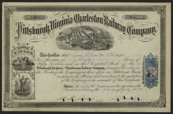 Pennsylvania, 1872, I/C, #21, 60 Shares, Black print with ornate black border, Vignette of Pittsburgh harbor top center with state seals on left side, POC's, VF condition, Hani Armor & Fenrhake Litho. Blue 25cent Washington Revenue Stamp. Benjamin F. Jones signed certificate with both railroad and stock in Cox. Jones was a Pittsburgh industrialist best known for J&L Steel, he was chair of the Republican National committee between 1884-1888.
