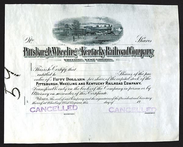 West Virginia. -Odd Shrs Stock Certificate. Distinctive vignette of locomotive and passenger car. Black plate destruction file proof from the 1920s. Handstamped CANCELLED several times, with large crayon 59 at left end. Dirty.