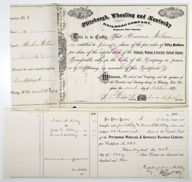 Wheeling, West Virginia, Lot of 2 pieces. Includes I/C stock certificate for 4 Shares, S/N 8, Ornate title and counterfoil with allegorical woman on left. VF condition. Also include a transfer receipt for certificate #265 for 24 shares. VF. (2)