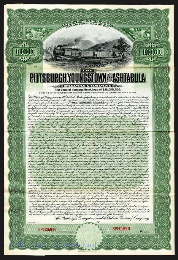 Ohio, Pennsylvania, 1908, Specimen $1000 1st Gen.Mortgage 4% Gold Coupon Bond, S Freight or coal train, Green, ABNC, POC's, XF. Only known as a specimen in Cox.