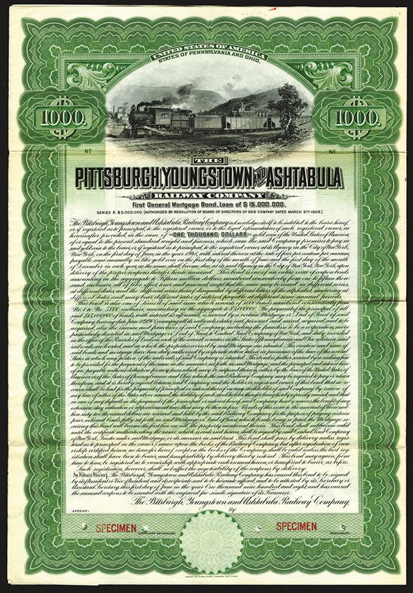 Pennsylvania & Ohio, 1908, $1000 1st General Mortgage Specimen Bond, Black print with green border and underprint, Moving locomotive top center, POC's and red SPECIMEN overprints, VF condition, ABNC. Listed railroad but unlisted bond in Cox.