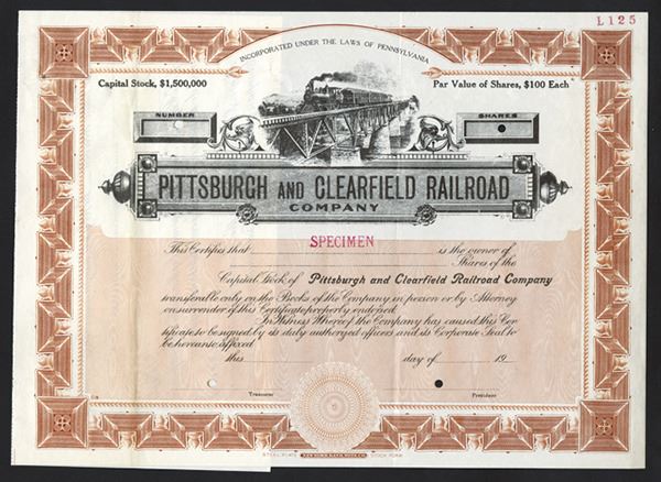 Pennsylvania. Odd Shares Capital Stock Specimen Certificate, Black print on ornate brown border and under tint, Drawing of locomotive crossing bridge at top, Specimen overprints and POC's, VF-XF condition, NYBNC.