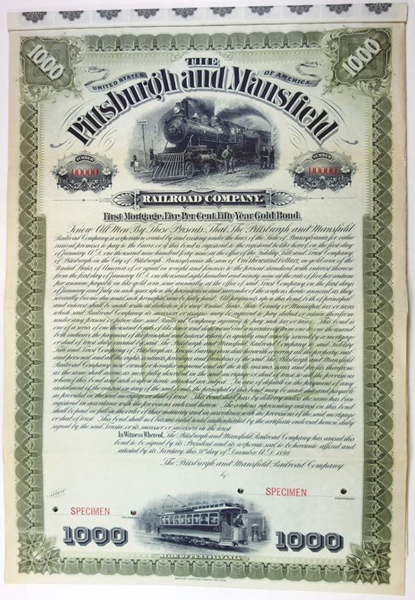 Pennsylvania. $1,000 Specimen 5% 1st Mortgage Fifty Year Gold Coupon Bond, Black print on olive green border and under tint, Man standing beside engine at top, Specimen overprints and POC's, VF-XF condition, ABNC. Unlisted Railroad on Cox.