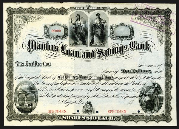 Augusta, Georgia. 18xx (1885), Odd Shares, Specimen, Ornate with Standing justice and Liberty at top with Georgia arms LL and Slaves loading cotton LR., Specimen overprint, POC, VF, Continental BNC. Rare early Georgia banking stock.