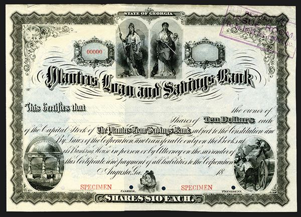 Augusta, Georgia. 18xx, Odd Shares, Specimen, Ornate with Standing justice and Liberty at top with Georgia arms LL and Slaves loading cotton LR., Specimen overprint, POC, VF, Continental BNC. Rare early Georgia banking stock.