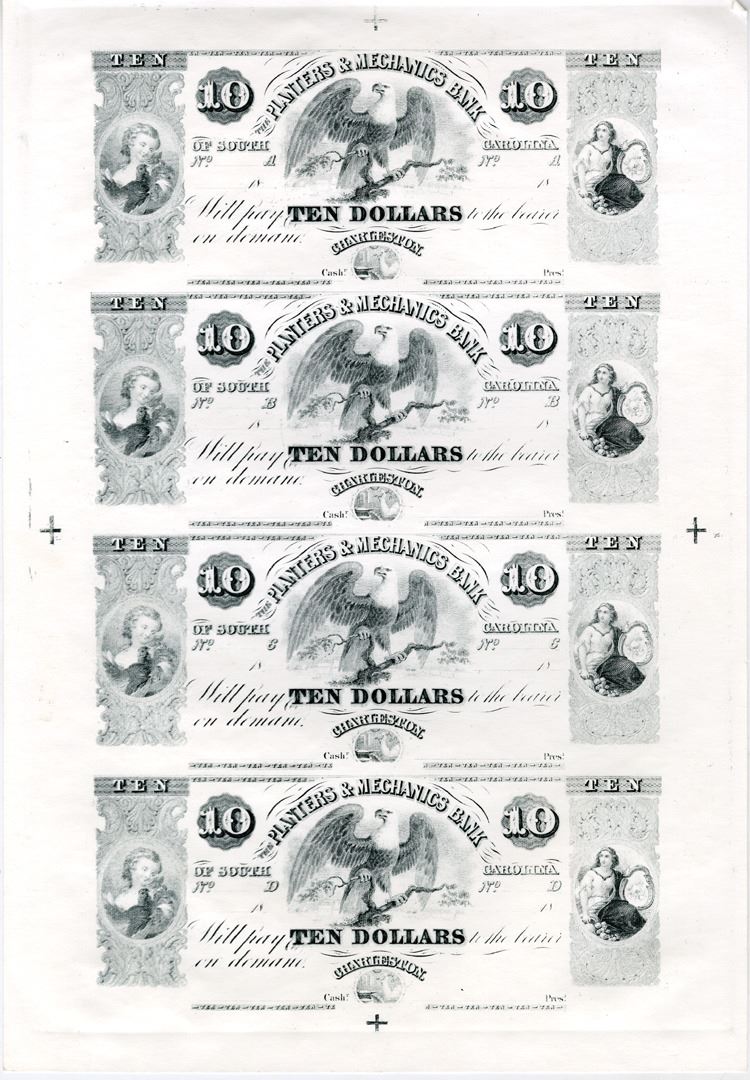 Charleston, South Carolina. Lot of 4 notes (uncut sheet of 4), ND (Originally printed 1850-60's, this sheet is ca.1950-70's), $10-10-10-10, (SC-25-G24a), Modern "Proprietary Proofs". Black printing without underprint, printed on thin white card, Eagle under title in middle flanked by allegorical women on left and right, Uncirculated to CU+ condition. ABNC. Archival "Proprietary" proofs rarely seen in sheet form.