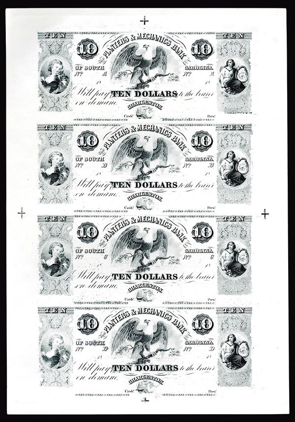 Charleston, South Carolina. Lot of 4 notes (uncut sheet of 4), ND (printed 1850-60's, this sheet is ca.1970's), $10-10-10-10, (SC-25-G24a), Modern "Proprietary Proofs". Black printing without underprint, printed on thin white card, Uncirculated to CU+ condition. ABNC. Archival "Proprietary" proofs rarely seen in sheet form.