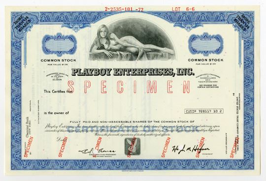 Delaware, 1972. Playboy Enterprises, Inc., >100 Shares Specimen Stock Certificate, Black text with blue border and blue underprint, Nude woman reclining at top center, Facsimile signature of Hugh Hefner at bottom right as company President. Red specimen overprints and Specimen POCs. Uncirculated to CU condition, ABNC. Playboy Enterprises, Inc. is an American privately held global media and lifestyle company founded by Hugh Hefner to oversee the Playboy magazine and related assets. It is currently headquartered in Beverly Hills, California. The company is structured with two primary business segments: Media and Licensing.