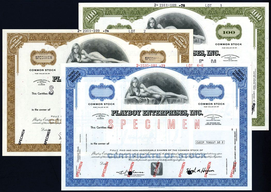 Lot of 3 specimen certificates, Includes less than 100 Shares, brown border; 100 Shares, Olive green border and greater than 100 Shares, Blue border, Specimen overprint and POC's Hugh Hefner facsimile signature. XF condition. ABNC. "The censored version" with the famous reclining nude model's hair conspicuously placed over her enhanced features. ABNC.