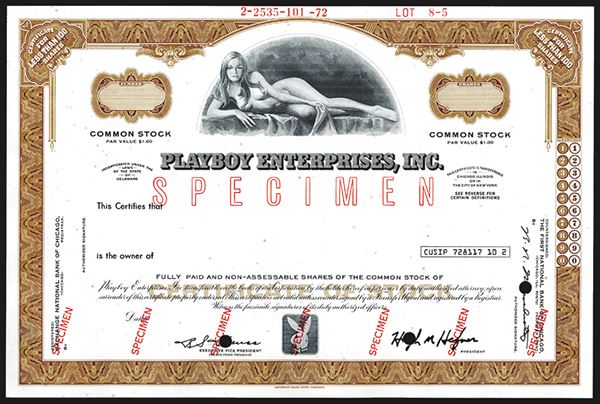 Specimen. Less Than 100 Shares. Common stock. Chestnut brown border. Red specimen overprint and POC's, reclining Playboy Bunny on top, Hugh Hefner facsimile signature. XF condition. ABNC. "The censored version".