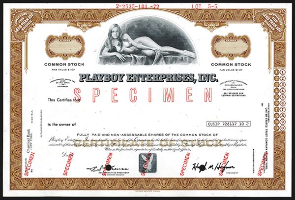 Specimen Stock, <100 Shares, Brown border, Specimen overprint and POC's Hugh Hefner facsimile signature. XF condition. ABNC. "The censored version" with the famous reclining nude model's hair conspicuously placed over her enhanced features. ABNC.