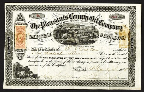 Pleasants County, WV (Inc. in NY), 1000 Shares, I/U, large image of barges, oil wells and barrels in middle and lower left, S/N 26, VF with toning on right from revenue stamp on left. Scarce and attractive.