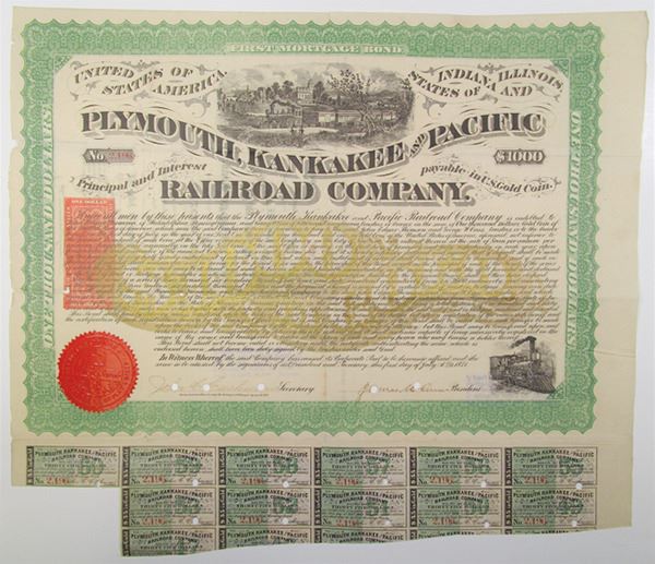 IN & IL. $1000 I/C 7% First Mortgage Gold Coupon Bond, Black text with green border and golden undertint, Train passing through countryside at top center. POCs, VG due to extensive archival reinforcement at folds, signed by J.Edgar Thompson as trustee. U.S.I.R. RN W-2 imprinted revenue on front left. Red seal. John Edgar Thomson was an American civil engineer and industrialist. An entrepreneur best known for his leadership of the Pennsylvania Railroad from 1852 until his death in 1874, Thomson made it the largest business enterprise in the world and a world-class model for technological and managerial innovation. Henry Seibert, (Sold As Is - No Returns accepted)