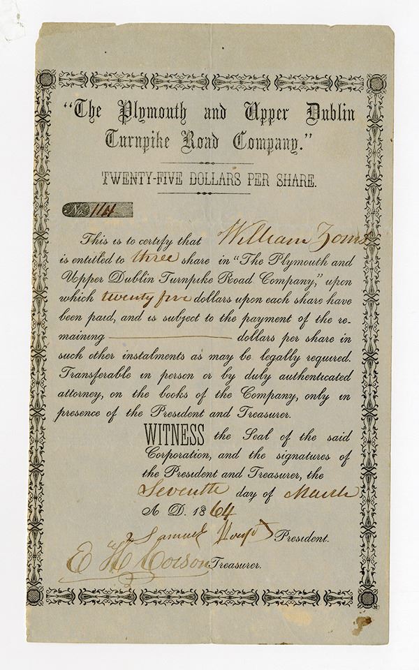 Early Pennsylvania Turnpike Stock Certificate, March 7th, 1864, 3 shares, I/U, Black on light gray, S/N 114, Fine with small edge splits, scarce.
