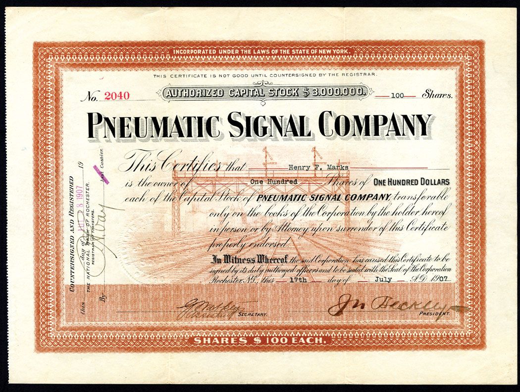 Rochester, NY. 100 Shares, I/U, Black on brick red border and underprint of signal towers and railroad tracks in middle. XF.