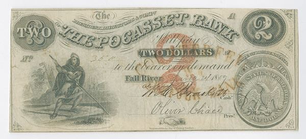 Fall River, RI. 1859, $2, Cr-P-560, Hx-500-C22a, W-380-C20a, Issued obsolete banknote, black printing with red "2" underprint, Native American poling raft at left, 2 Silver dollars at right, S/N 350, VF condition, HH&W. Attractive and scarce banknote.