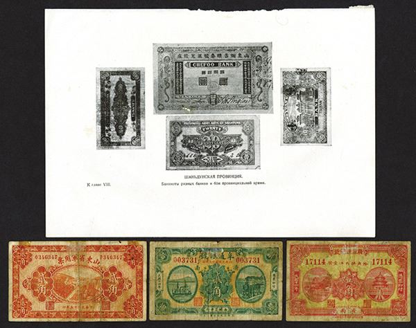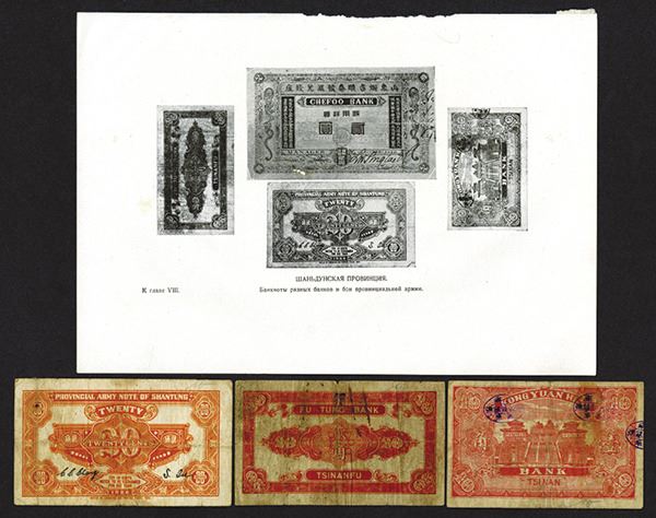 China, Lot of 3 notes, Includes 1926 Provincial Army (Note) of Shantung, 2 Chiao=20 cents, P-S3937 S/M#S44-11, Issued, Orange with Great Wall, S/N 0346347, VF with tape remnant on top left and right face; and 2 different Private Local Issue Banknotes Including and Tsinan, China, ND (ca.1915-20's), Kong Yuan Hang Bank, 10 cents, P-Unlisted, Orange with temple on right and building on left, back with building, S/N 17114, Choice Fine with stamp hinge remnant on middle face; and, Tsinanfu, China, ND (ca. 1915-30's), 20 cents, P-UNL, issued, green on light orange, train on right, ship on left, back red, S/N 003731, Includes the original page from his book picturing all of the notes in this lot. All 3 of these notes are the Plate notes from Pogrebetsky's personal reference collection and are the photographed plate notes from his rare Chinese banknote book published in Harbin in 1929. A unique and historic reference item that is sure to attract attention. (The Pogrebetsky Family Archives)