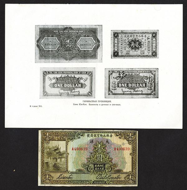 China, 1926, Kirin Yung Heng Provincial Bank, $1 Big Money, P-S1066 S/M#C76-131, Issued, Dark black-brown on m/c, S/N A490639, VF condition with 5 very small pin holes and tape remnants on top left and right margin. Includes the original page from his book picturing the note in this lot. This is the Plate note from Pogrebetsky's personal reference collection and it is photographed in his rare Chinese banknote book published in Harbin in 1929. A unique and historic reference item that is sure to attract attention. (The Pogrebetsky Family Archives)