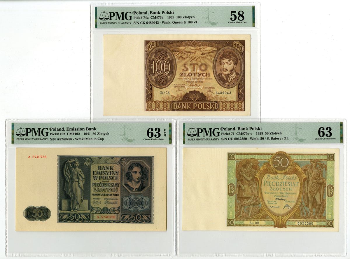 Poland, 1929-41. Lot of 3 Issued Banknotes, Includes: Bank Polski, 1929, 50 Zlotych, P-71 CM#70a-c, PMG Choice Uncirculated 63 with comment "Minor Foreign Substance;" 1932, 100 Zlotych, P-74a CM#73a, PMG Choice About Unc 58; Emission Bank, 1941, 50 Zlotych, P-102 CM#102, PMG Choice Uncirculated 63 EPQ. (3). Sold "AS IS" no returns accepted.