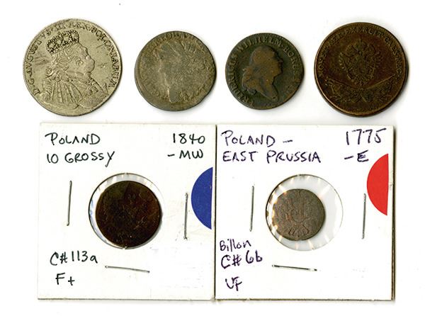 Poland, group of 6 coins, includes 18 Groszy (Tympf), 1754, KM-148.2 from August III's reign, VF-XF; Szostak, 1763, KM-117 from Danzig, about Fine; Solidus, 1775, C# 6B from Friedrich II's rule of the Prussian Possession, VF; 3 Grosz, 1794, C# 5 from Galizia and Lodomeria, VF; and 1 Grosz, 1797, C# 3, Fine+ from the Province of Poland. Also included from the Kingdom of Poland under Nicholas I, 1840, C# 113a in Fine+ condition.