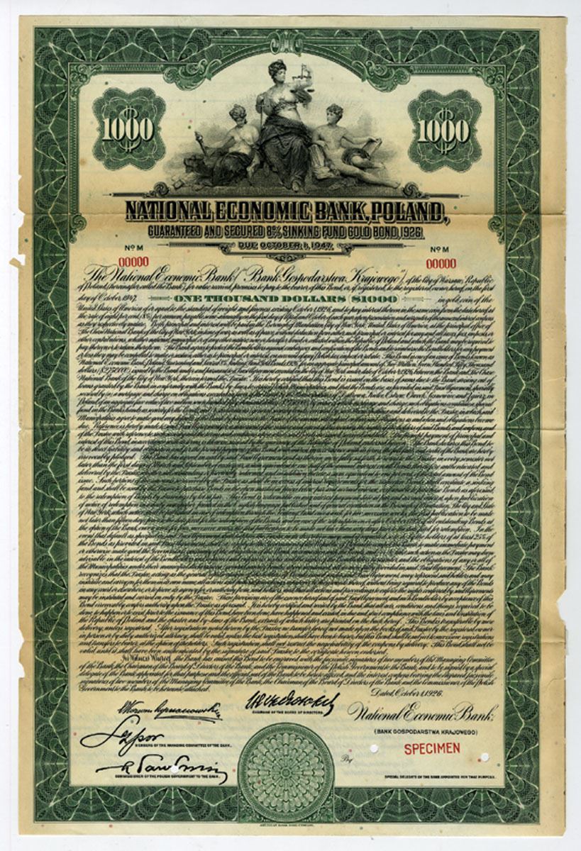Poland, October 1st, 1926. $1000 Specimen 8% Guaranteed and Secured Sinking Fund Gold Coupon Bond, Black print with green border and underprint, Allegorical Justice with scales and sword flanked by allegorical nude young man and woman, Written in English, Specimen overprints and POC's, Fine to VF condition with archival reinforcement and small missing pieces from left border, coupons included but not attached, ABNC.