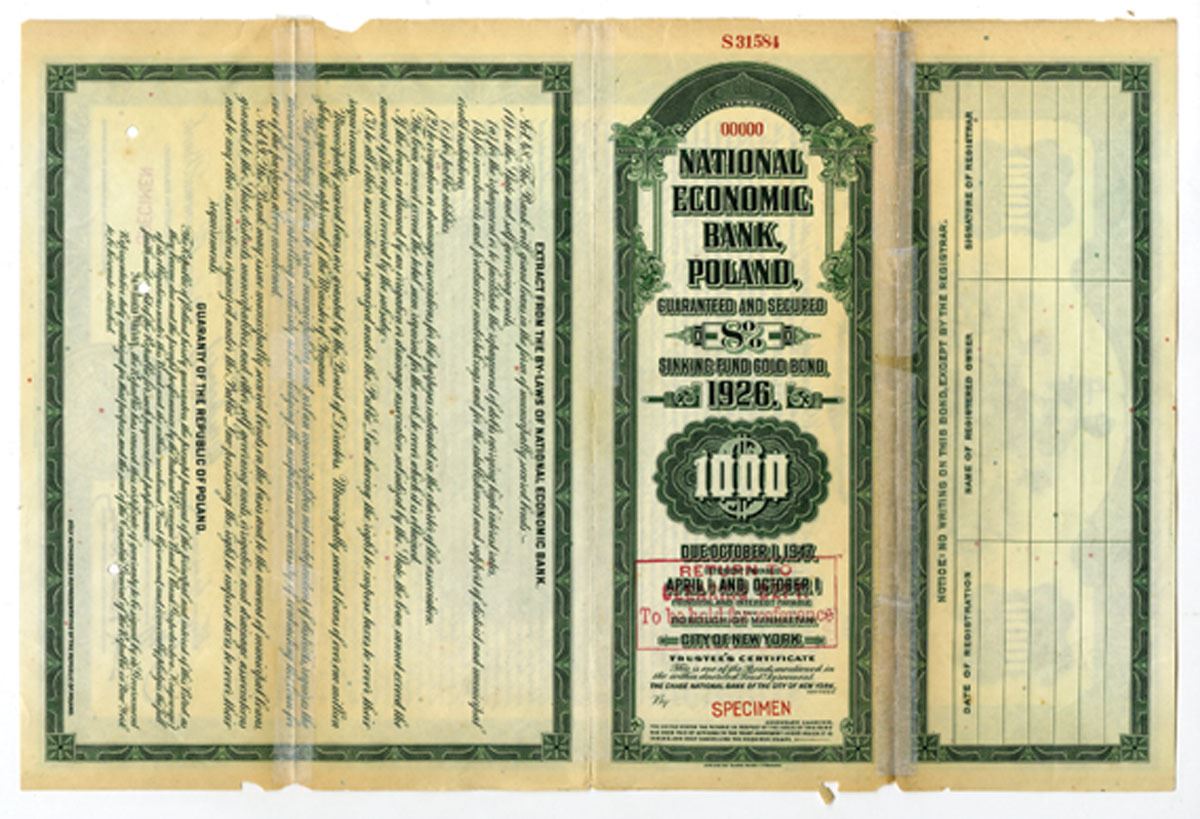 Poland, October 1st, 1926. $1000 Specimen 8% Guaranteed and Secured Sinking Fund Gold Coupon Bond, Black print with green border and underprint, Allegorical Justice with scales and sword flanked by allegorical nude young man and woman, Written in English, Specimen overprints and POC's, Fine to VF condition with archival reinforcement and small missing pieces from left border, coupons included but not attached, ABNC.