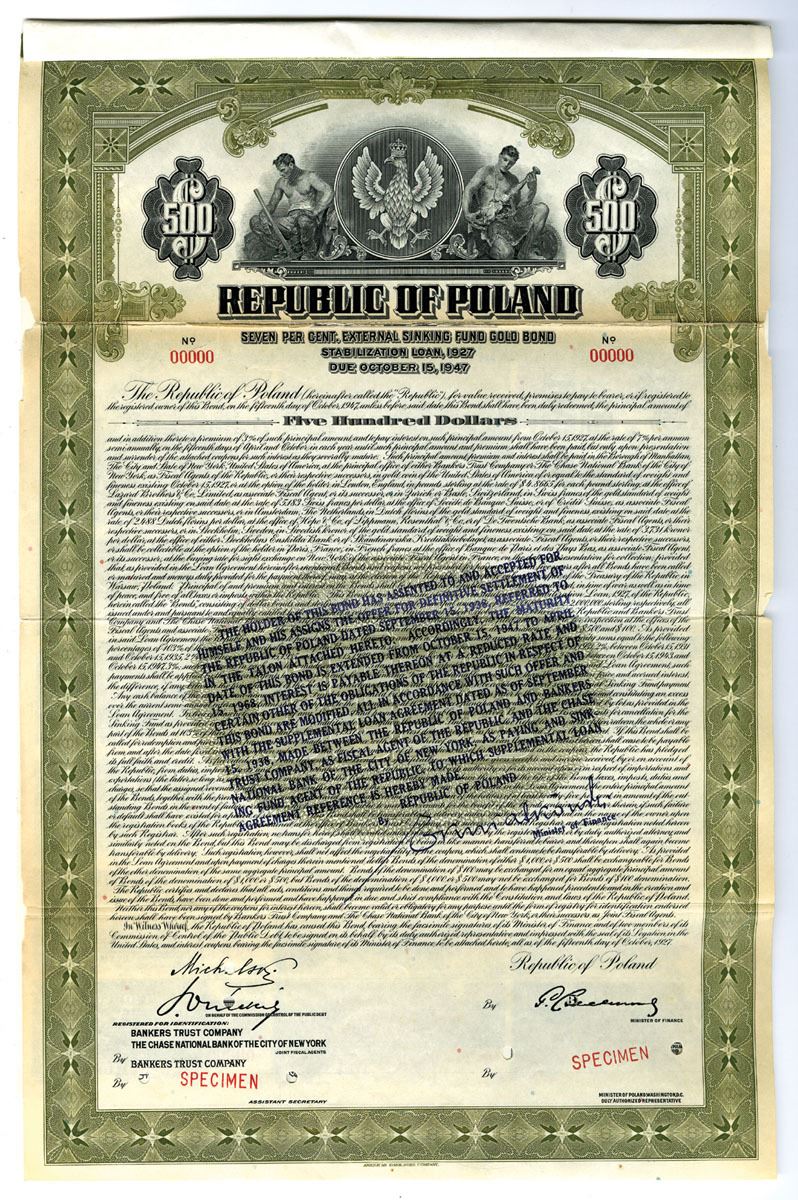 Poland, 1927 (Reissued in 1938.) $500 Specimen 7% External Sinking Fund Gold Bond - Stabilization Loan of 1927, printed in English, Black with olive green border and underprint, Allegorical men at top flanking arms of Poland at top center, Blue overprint at center extending bond to 1968, Specimen overprints and POCs, VF condition with archival reinforced fold lines, ABNC. Extremely rare with only 2 examples found in the ABNC Archives in 2002.