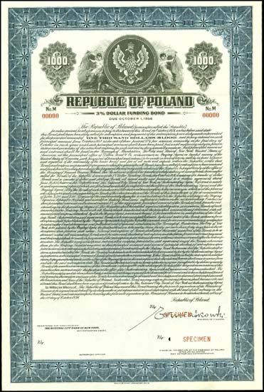 October 1st, 1936. Specimen bond. $1000. Blue border and undertint. 3% Dollar Funding Bond. Arms of Poland vignette flanked by allegorical angels. Written in English. Blue specimen overprints, 00000"serial numbers and POC's. Coupons attached. XF condition. ABNC. Rare Polish specimen bond.