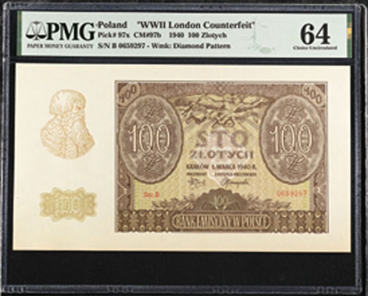 Poland, 1940. 100 Zlotych, P-97x CM#97b, Issued WWII London Counterfeit Banknote, Brown on light green and orange underprint with patrician of old Warsaw at left, Back is brown and green with church at center, S/N 0659297, Watermark in diamond pattern, PMG graded Choice Uncirculated 64.