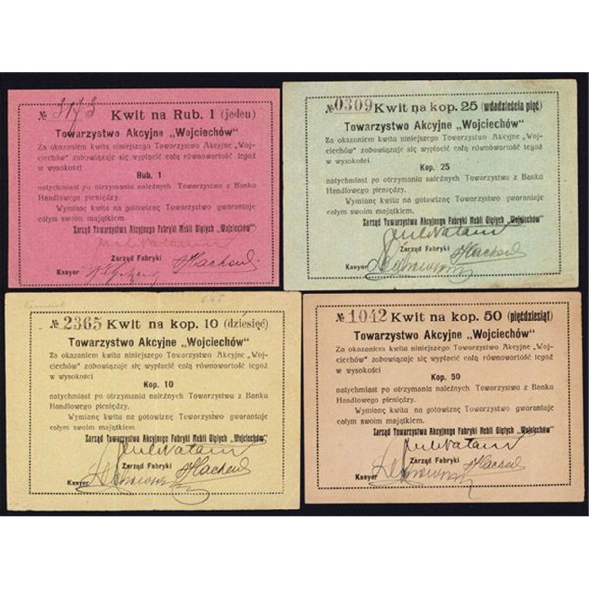 Poland, Lot of 4 Emergency notes, All ND (1914), Includes 10 Kopeks; 25 Kopeks; 50 Kopeks and 1 Ruble, all in different colors, Wojciechowski Board of the Association Equity company, All are signed with multiple signatures and Serial Numbers, All are in XF to AU condition. Rare WW I related Scrip notes. Also includes the Margess's original envelopes they were kept in.