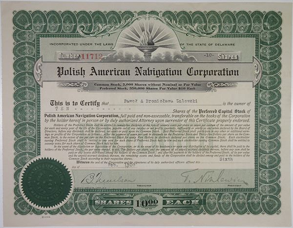 Delaware. 10 Shares Preferred Capital Stock I/U Certificate, Black print on green border and underprint. Torch with light radiating at top. VF-XF condition. Goes.