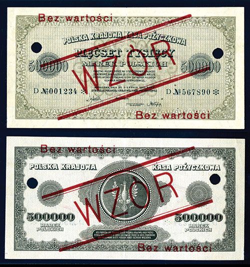 Poland, 1923. 500,000 Marek. P-36 (CM#36hs), Unlisted Specimen banknote. Red “WZOR” and “Bez wartosci” overprints with serial numbers “D No. 001234* - D No. 567890*”. POC's. Arms of Poland on back. PMG graded Extremely Fine 40, with 1 light vertical center fold. Rare note in any condition as a specimen.