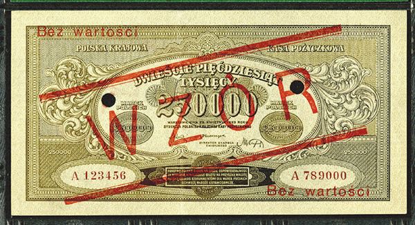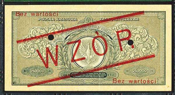1923. 250,000 Marek. P-35 Unlisted Specimen banknote. Red "WZOR" and "Bez wartosci" overprints with serial numbers "A 123456 - A789000". POC's. Arms of Poland on back. Note grades VF+ to XF with 1 vertical fold and one paper clip mark on UL corner area, otherwise it would grade AU to AU+. Rare note in any condition as a specimen.