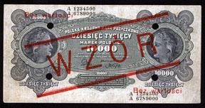 1922. 10,000 Marek. P-32 Unlisted Specimen banknote. Red "WZOR" and "Bez wartosci" overprints with serial numbers "A 1234500 - A 6789000". POC's. Greenish black on light tan. Woman's head on left and right. Note has 3 vertical folds, with 2 being extremely light and some light handling evidence, but otherwise in VF to VF+ condition with claims of XF. Rare note in any condition as a specimen.