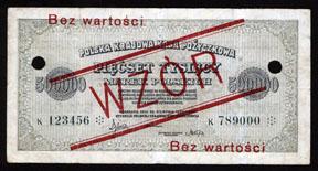 1923. 500,000 Marek. P-36 Unlisted Specimen banknote. Red "WZOR" and "Bez wartosci" overprints with serial numbers "A 123456 - A789000". POC's. Arms of Poland on back. Note grades VF with 3 light vertical folds and one horizontal fold. Rare note in any condition as a specimen.