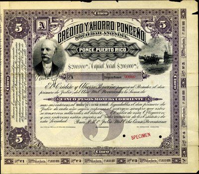1895. 5 Pesos. Specimen bond. Ornate title with sailor on right and portrait of notable on left. Purple border. Red specimen overprint, "0000" serial numbers and POC's. Rare early Puerto Rico bond. VF condition. Rare bond. ABNC.