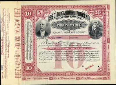 1895. 10 Pesos. Specimen bond. Ornate title with allegorical woman on right and portrait of notable on left. Red border. Red specimen overprint, "0000" serial numbers and POC's. Rare early Puerto Rico bond. VF condition. Rare bond. ABNC.