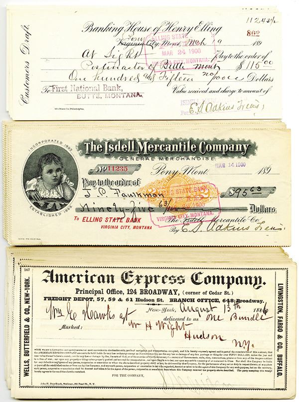 Pony, Montana and New York, Group of over 30 Issued checks, from a variety of 3 financial institutions: Banking House of Henry Elling; Isdell Mercantile Co.; American Express Co. All are from 1860-1900s, and are in Fine condition. (30+)