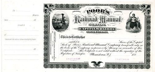 Morristown, New Jersey, 188x, Odd Shares, Proof stock certificate with counterfoil on left printed in black on india paper on card, Purple Specimen overprints, Locomotive top left, Seated Justice top right, title in middle, Rare an possibly unique certificate of this famous company known for their large and informative railroad manuals, Hamilton BNC.