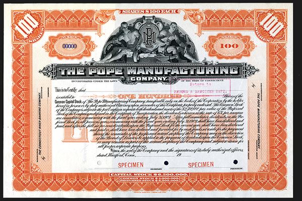 Hartford, Connecticut. 1909, 100 Shares, Specimen, Pope Manufacturing Company was founded by Albert Augustus Pope in 1877 in Boston, Massachusetts. Manufacturing began in 1887 in Hartford, Connecticut, at the Weed Sewing Machine Company factory. Pope manufactured bicycles, under the Columbia brand, motorcycles, and automobiles. It ceased automobile production in 1915, and ceased motorcycle production in 1918, but bicycles are still available under the Columbia brand. XF, ABNC. Rare early automobile and motorcycle manufacturer.