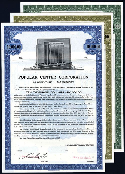 Puerto Rico, 1967, $1000-$5000-$10000, 6% Specimen Bonds, Black on Green-Olive-Blue borders and underprint, Banco Popular building top center, POC's and red SPECIMEN overprints, VF condition, ABNC.