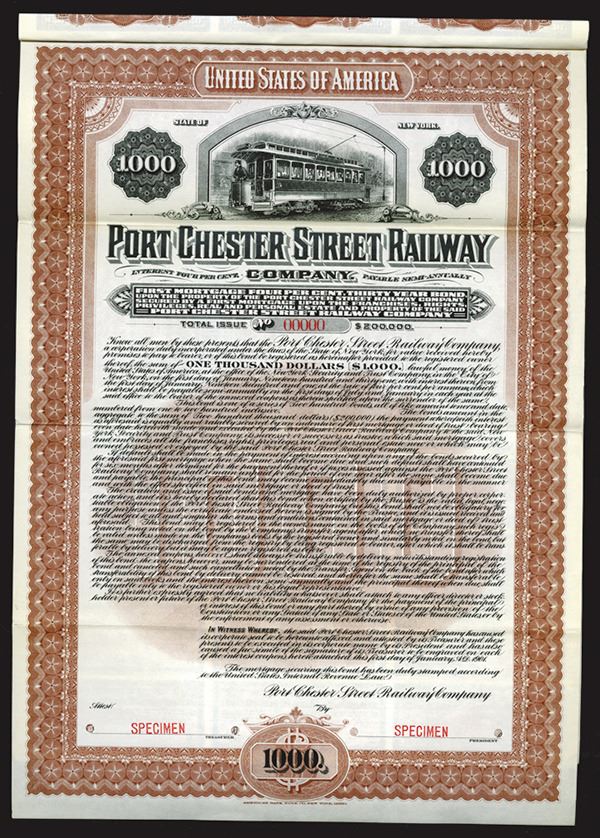 New York. $1000 Specimen 4% 1st Mortgage Coupon Bond, Black print on brown border and under tint, Electric street car at top, Specimen overprints and POC's, VF-XF condition, ABNC.